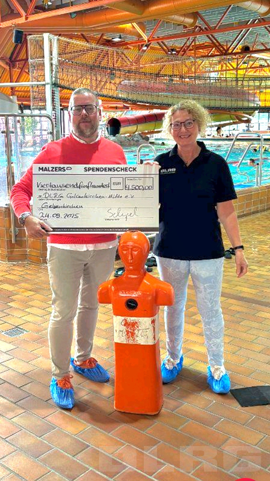 Mit einer großzügigen Spende von 4500 Euro unterstützt Malzers Backstube die DLRG Ortsgruppe Gelsenkirchen-Mitte e.V. bei ihrer wichtigen Arbeit: Kinder ans Schwimmen heranzuführen und Rettungsschwimmer auszubilden. Die Spendensumme stammt aus dem Verkauf des beliebten Malzers Jahreskalenders, dessen Erlöse jährlich sozialen Projekten zugutekommen.